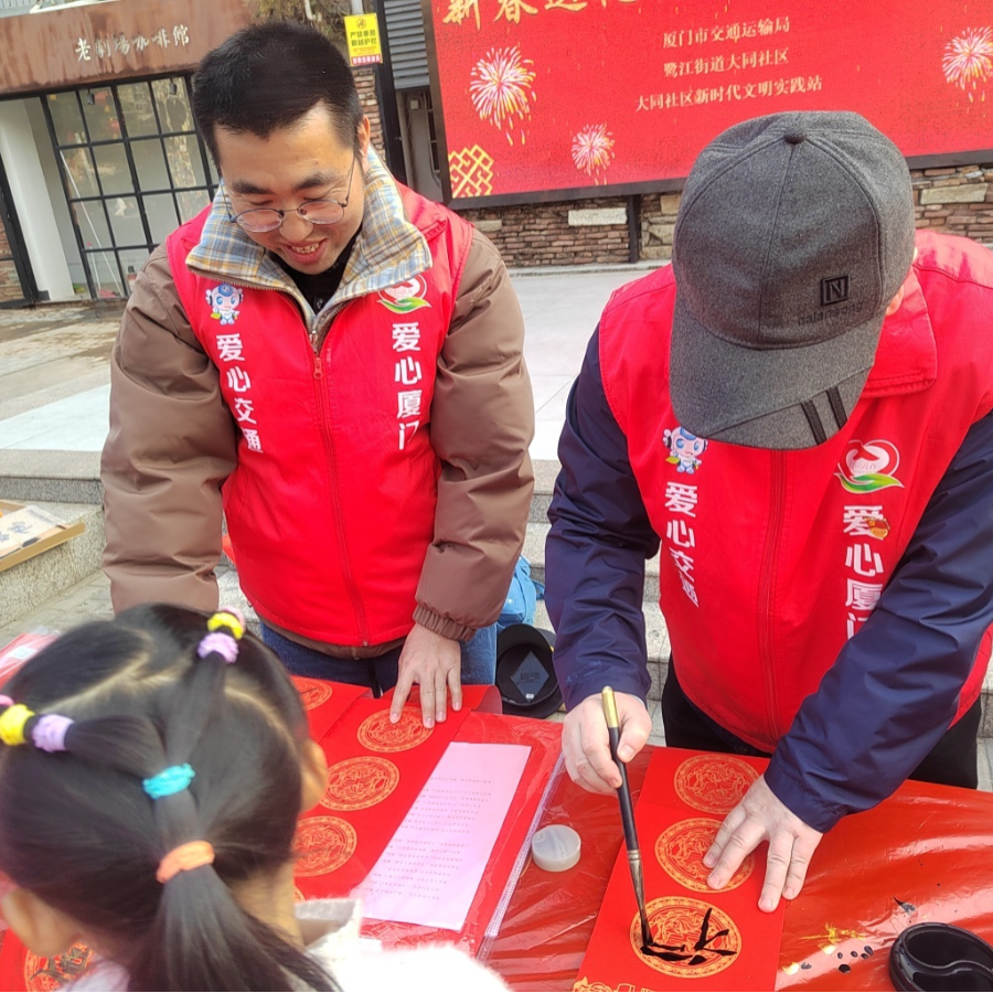 玉龙辞岁寒风尽,金蛇献瑞福门开,在新春佳节来临之际,为丰富群众精神文化生活,营造喜庆、欢乐、祥和的新春氛围,大力弘扬我们的节日和中华优秀传统文化,市交通运输局结合近邻党建和新时代文明实践工作,联合共建社区大同社区举办“新春送祝福·交通暖心行”新春送“福”活动,组织局机关、市运输中心、市交通执法支队、市交通质安中心、市交通监测中心、未来交通研究院等单位为社区群众送上春联、“福”字等,让社区群众真切感受传统文化就在身边,年味浓厚伴随左右。