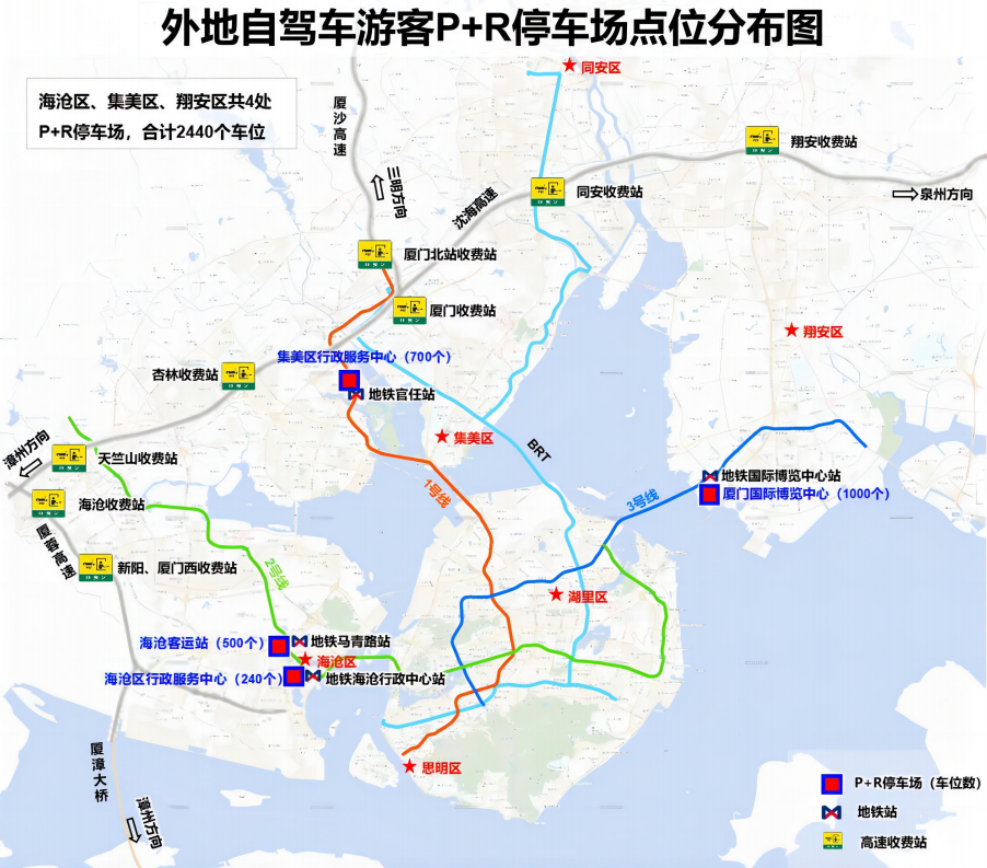 翔安区1处停车场(厦门国际博览中心)1000个车位,衔接轨道交通3号线国际博览中心站。