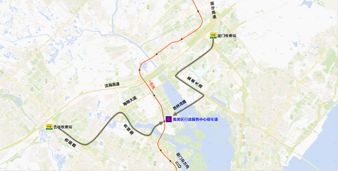厦门收费站→海翔大道→集美大道→杏林湾路→集美区行政服务中心停车场