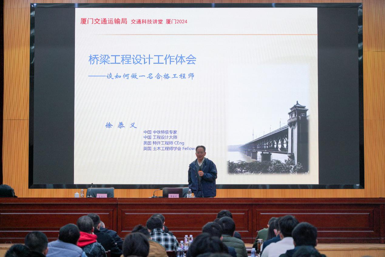 习近平总书记在“国家工程师奖”首次评选表彰之际指出,工程师是推动工程科技造福人类、创造未来的重要力量,是国家战略人才力量的重要组成部分。为持续提升厦门交通人才桥梁设计建设专业水平,在更高水平推进厦门交通运输事业高质量发展,1月22日上午,市交通运输局组织2024年第一届建筑美学与桥梁设计专题交通科技大讲堂,邀请中铁大桥院副总工程师、全国勘察设计大师徐恭义作《桥梁工程设计工作体会——谈如何做一名合格工程师》专题报告。徐恭义是澳门西湾大桥、柳州红光桥等国内30多座大型桥梁工程的总设计师,是我国现代悬索桥技术的开拓者和领军人,是首位获得美国约翰.罗布林终身成就奖的中国人,同时也是该奖项最年轻的获奖者。