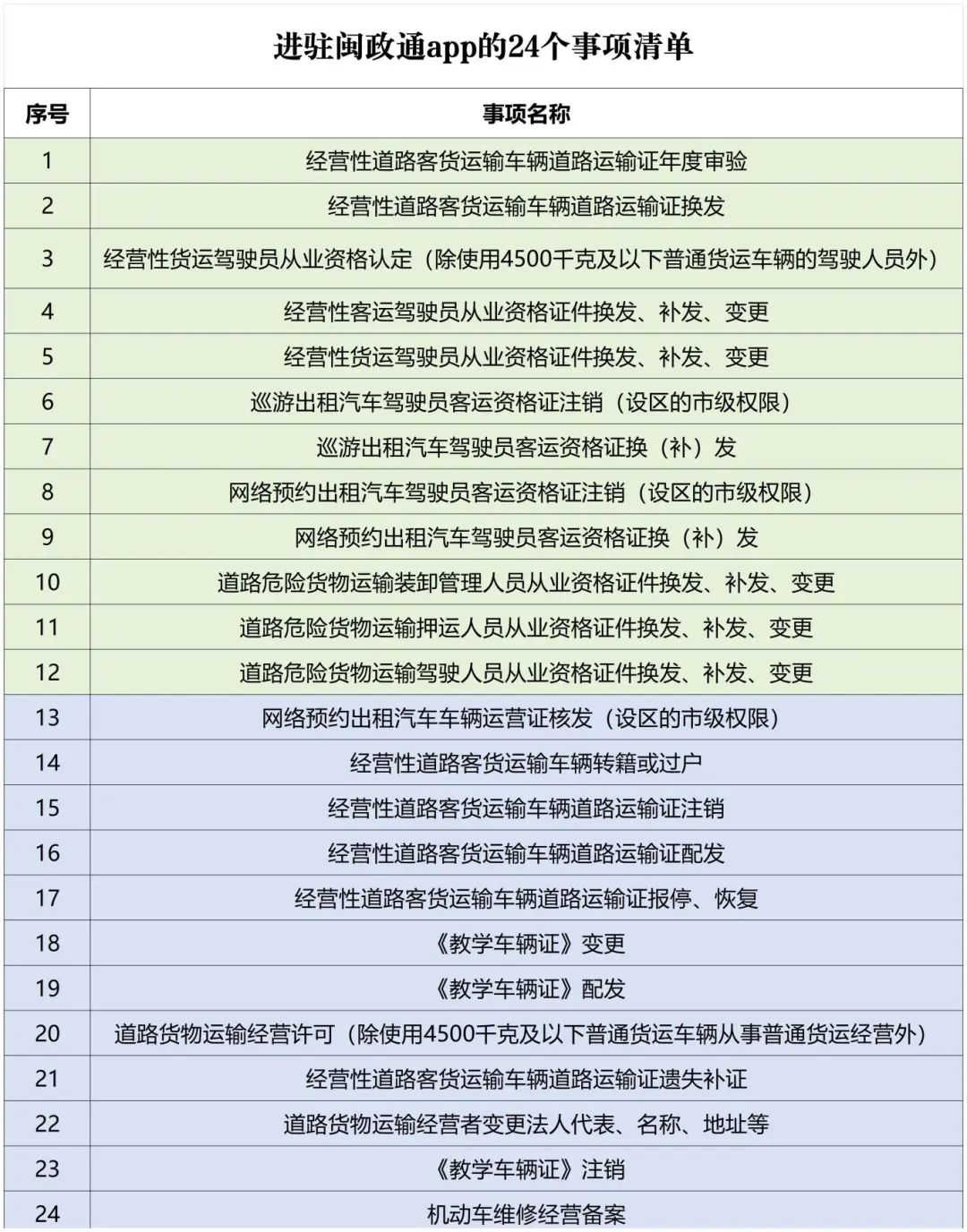 今年来,市交通局围绕政务服务领域,注重数字技术赋能,不断完善服务供给模式,除上述24个事项外,还积极推动国家重点“一件事”清单中的“开办运输企业一件事”落地见效并进驻新版闽政通。同时,扎实推进“数据最多采一次”工作,使入驻新版闽政通的相关审批服务事项实现表单数据免填写、电子材料免提交,大大提升群众办事体验感和获得感,努力让交通运输政务服务真正“一触即达”。