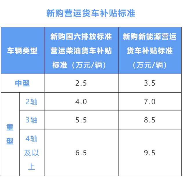 二是提前报废老旧营运货车后又更新购置车辆,即对报废后又新购国六排放标准货车或新能源货车的给予补贴,此类车主享有双重补贴,即补贴金额=提前报废老旧营运柴油货车补贴+新购营运货车补贴;