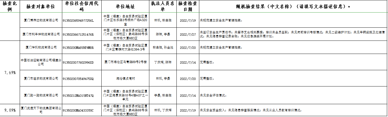 2022年7月货运行业随机抽查结果公示